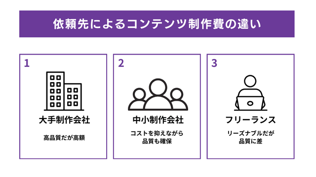 ここでは、主な依頼先に分けてコンテンツ制作費の違いを解説します。