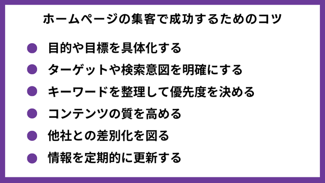 ホームページ集客の成功に欠かせないコツは以下のとおりです。