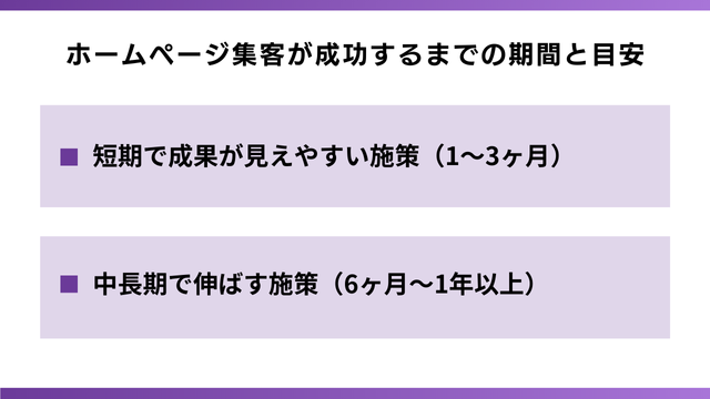 ホームページ集客は施策ごとに成果が出るまでの期間が異なります。Web広告のように短期間で成果が見える手法もあれば、SEO対策のように時間をかけて育てる施策も存在します。